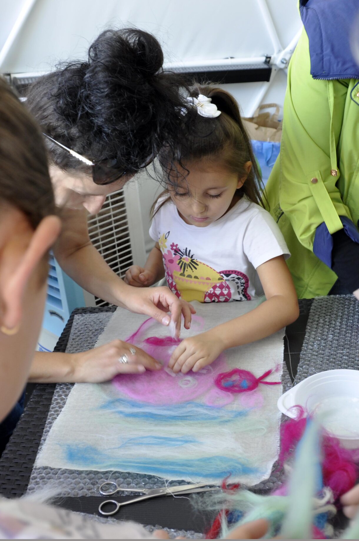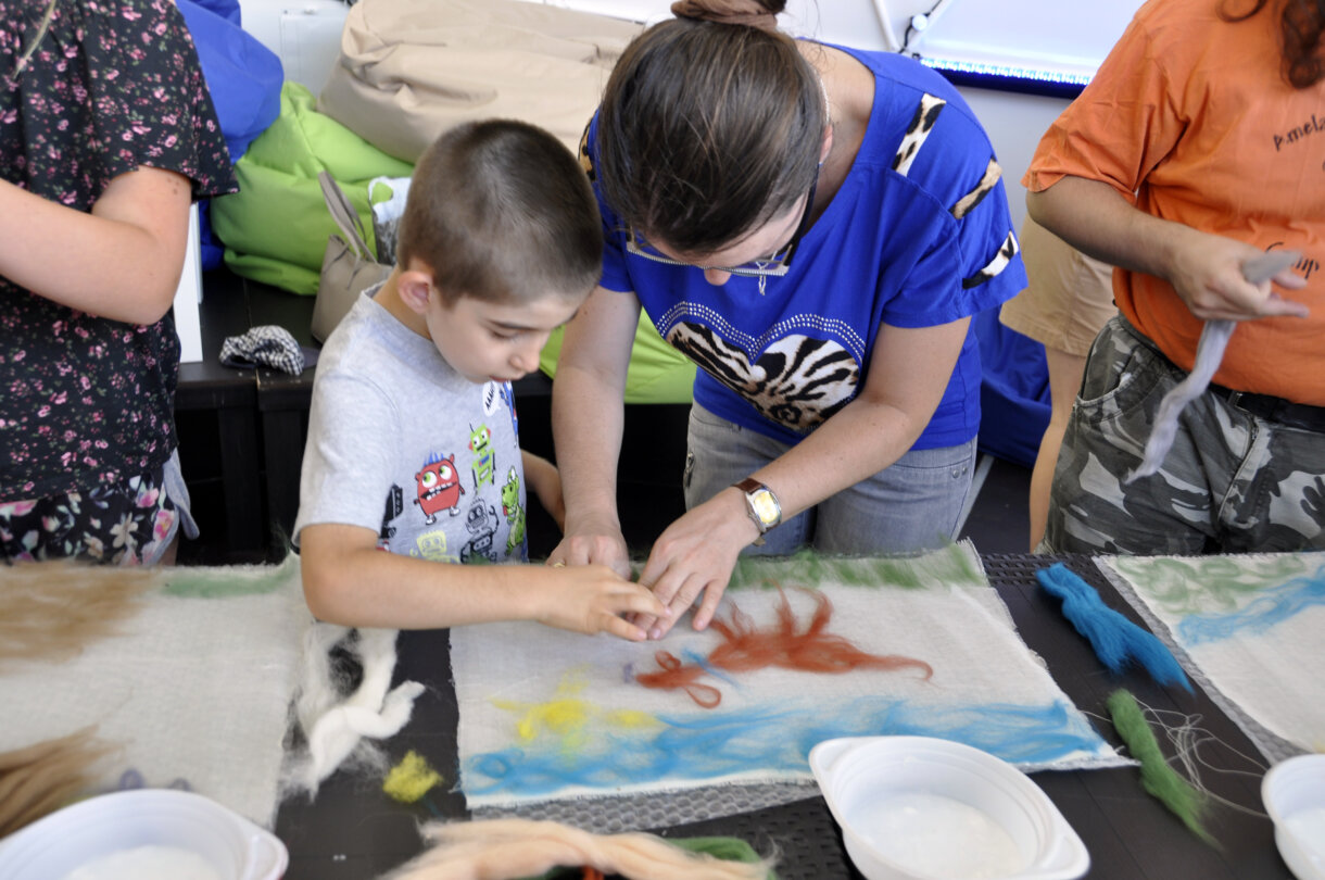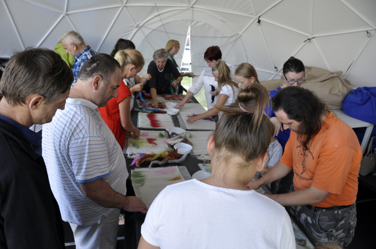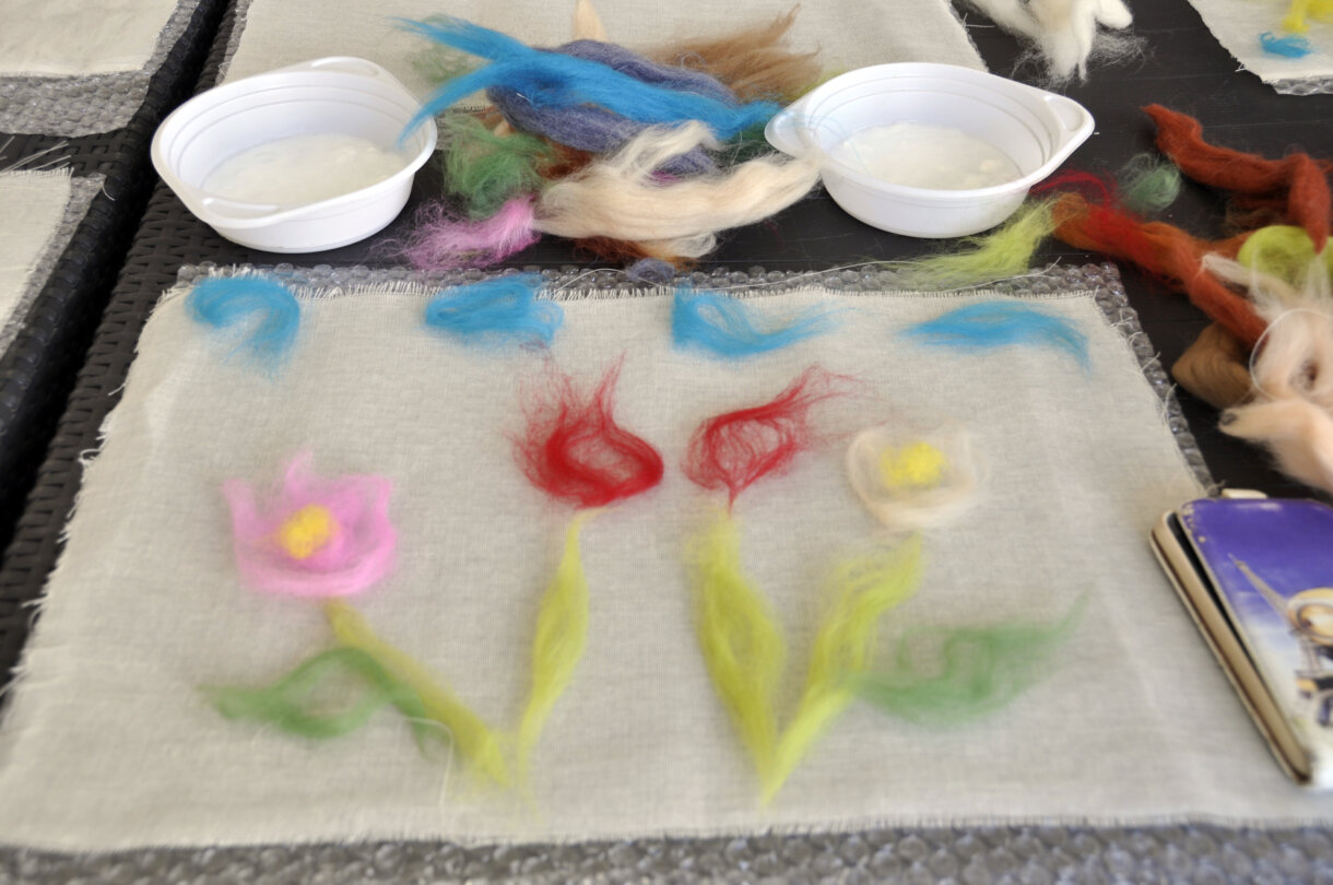 Podobraziem dla powstających kompozycji była bawełna, na której uczestnicy układali czesankę wełnianą.