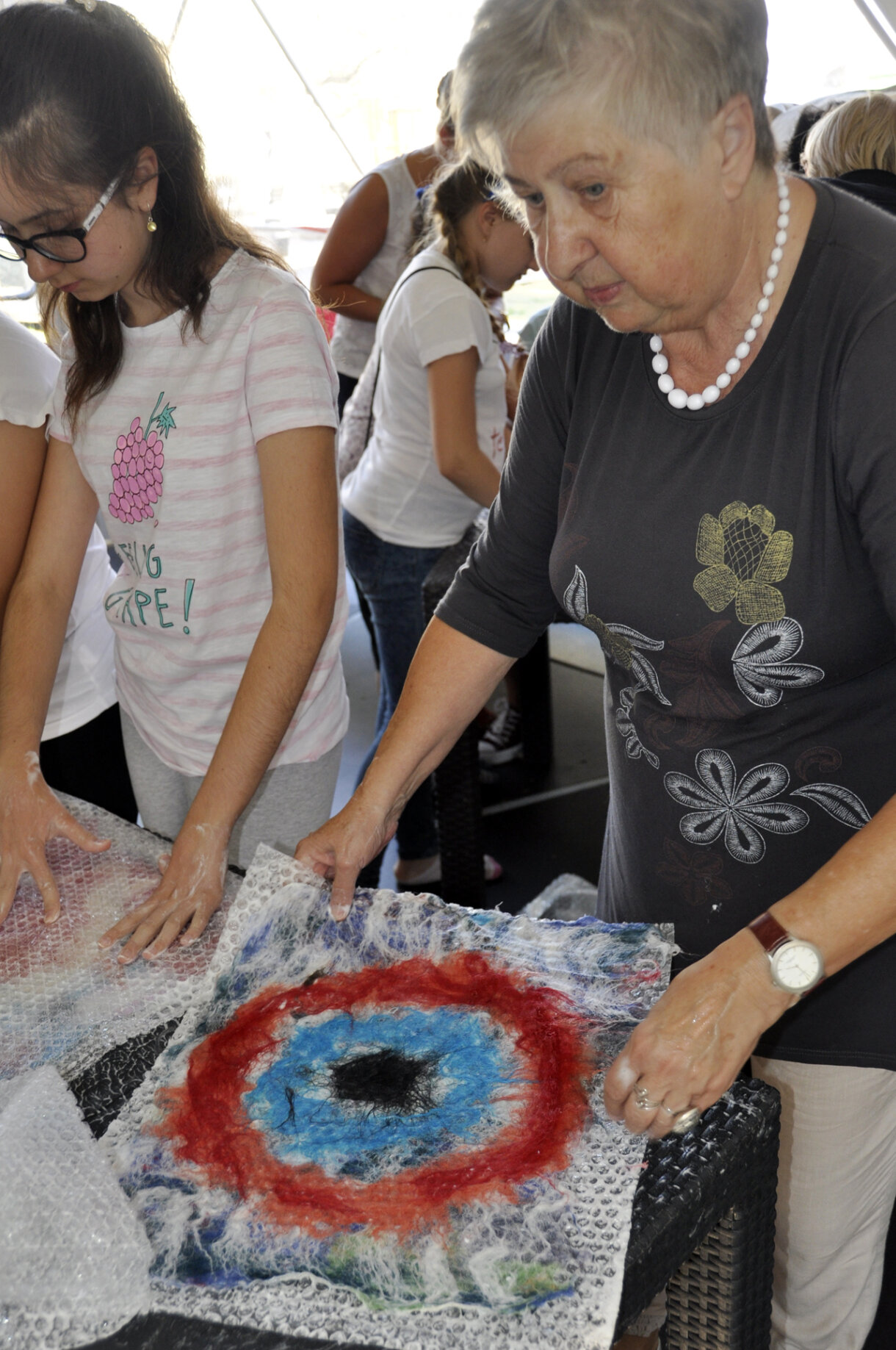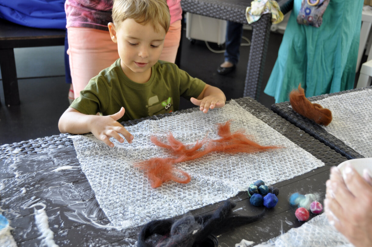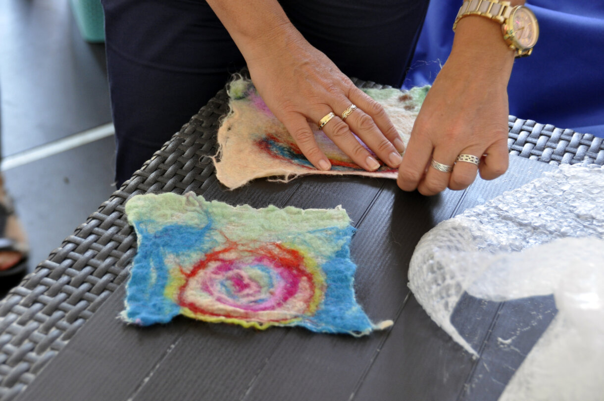 Kilka warstw kolorowych włókien łączono zwykłym, rozpuszczonym mydłem, a potem za pomocą folii bąbelkowej odbywał się proces filcowania.