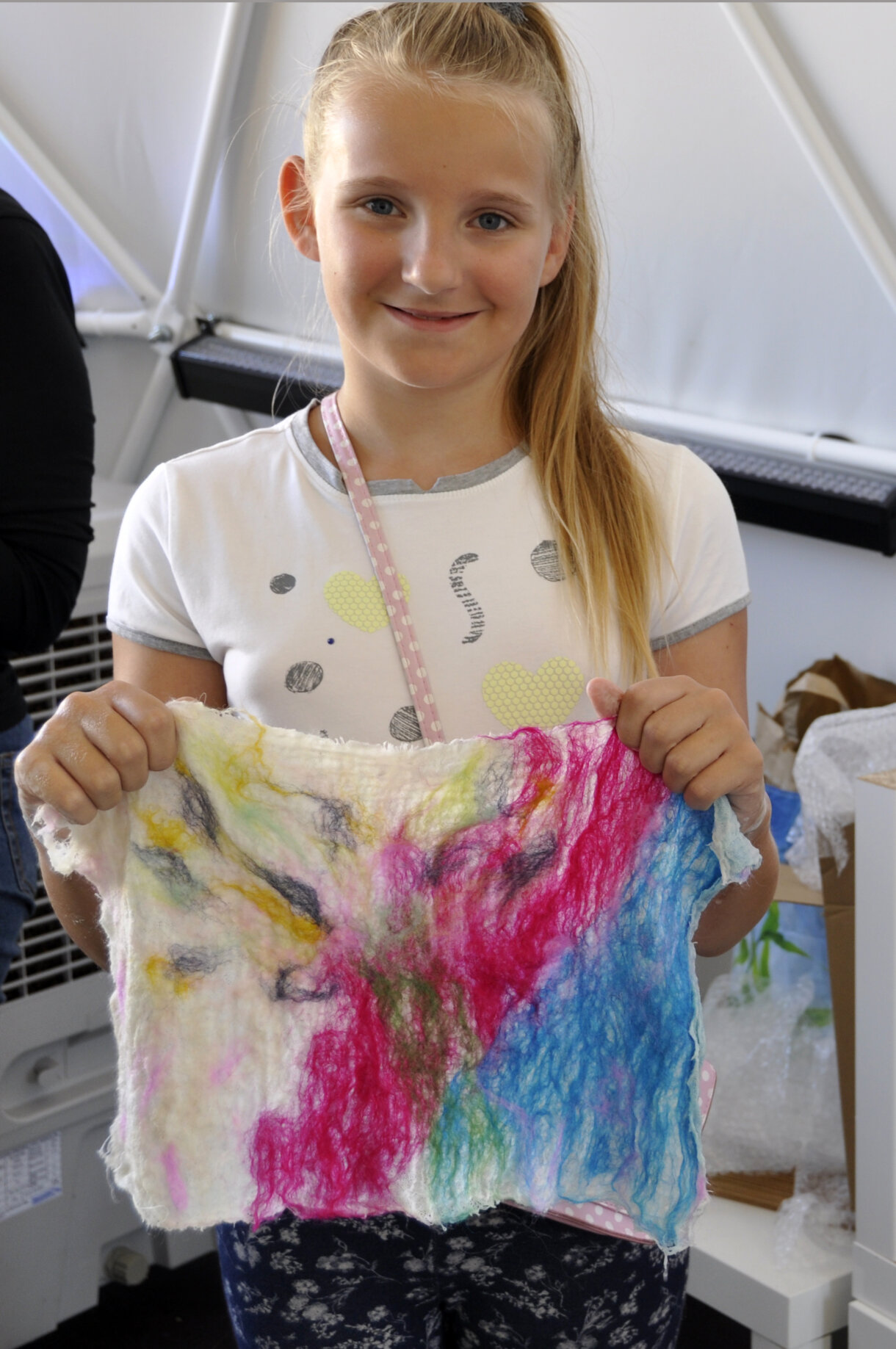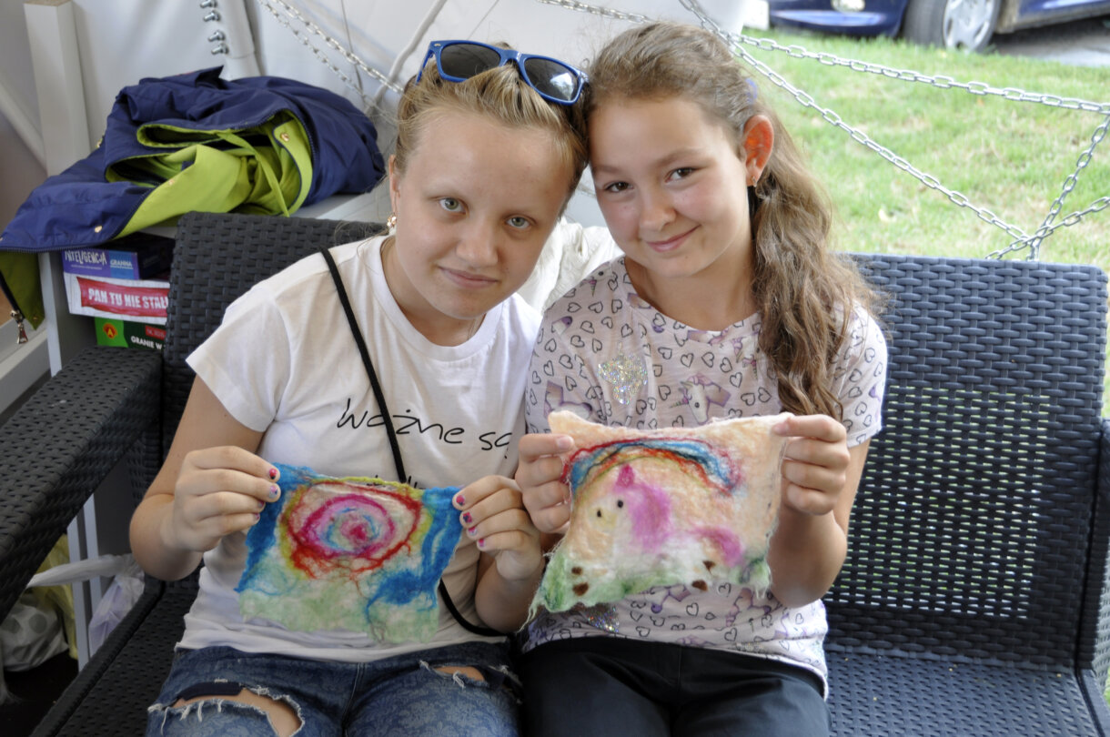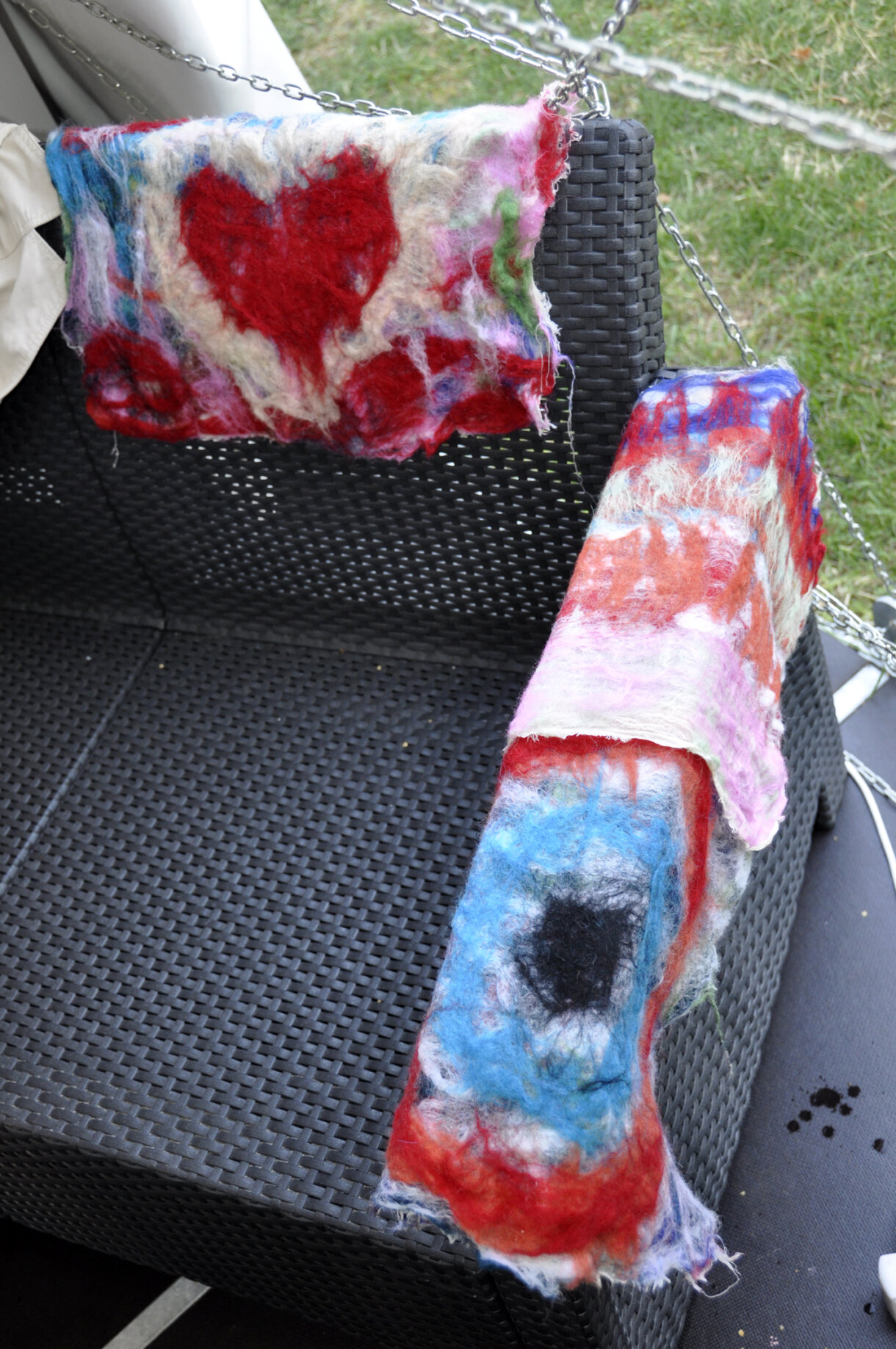 Kilka warstw kolorowych włókien łączono zwykłym, rozpuszczonym mydłem, a potem za pomocą folii bąbelkowej odbywał się proces filcowania.