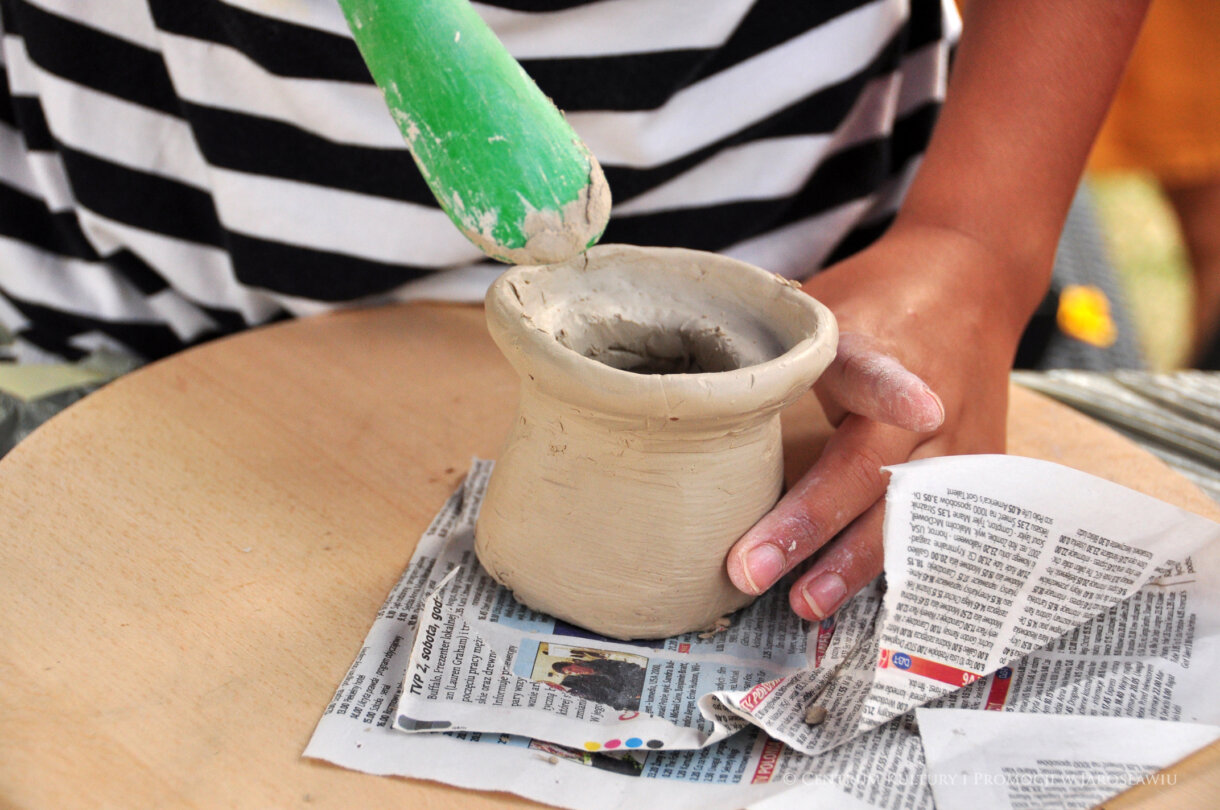 „Jest kilka technik lepienia ręcznego z gliny. Najbardziej pierwotną jest wygniatanie z kuli, lepienie z plastra lub z wałeczków” – opowiadała ceramiczka. Uczestnicy warsztatów zdobywali początkową wiedzę teoretyczną na temat samej gliny, jej wypału oraz pod profesjonalnym instruktarzem lepili dzbanuszki, które powstały wspomniana ostatnią techniką czyli właśnie z wałeczków.