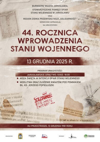 Burmistrz Miasta Jarosławia, Stowarzyszenie Pamięci Ofiar Stanu Wojennego w Jarosławiu oraz Region Ziemia Przemyska NSZZ „Solidarność” zapraszają na uroczystość 44. Rocznicy Wprowadzenia Stanu Wojennego.